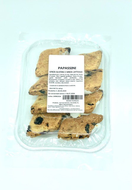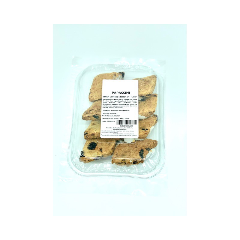 i papassini sono dei biscotti golosi che fanno parte della tradizione culinaria sarda, preparati in occasione delle festività di ognissanti. la ricetta è replicata in tutta la sardegna, seppur ogni zona ha adottato negli anni le dosi e gli ingredienti che riteneva più opportuni. l'ingrediente che non può mancare è l'uva passa, a cui viene aggiunta la frutta secca, la scorza grattugiata dei primi agrumi, e come spesso avviene nella pasticceria sarda, lo strutto. hanno la caratteristica forma romboidale, il colore ambrato, il profumo intenso e una pasta friabile. il gusto è caratterizzato dalla coesistenza tra la dolcezza degli zuccheri e la frutta appassita. Qui nella versione senza glutine e senza lattosio.